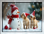 Bombki, Psy, Szczeniaki, Bałwanek, Zima, Czapki, Mikołaja