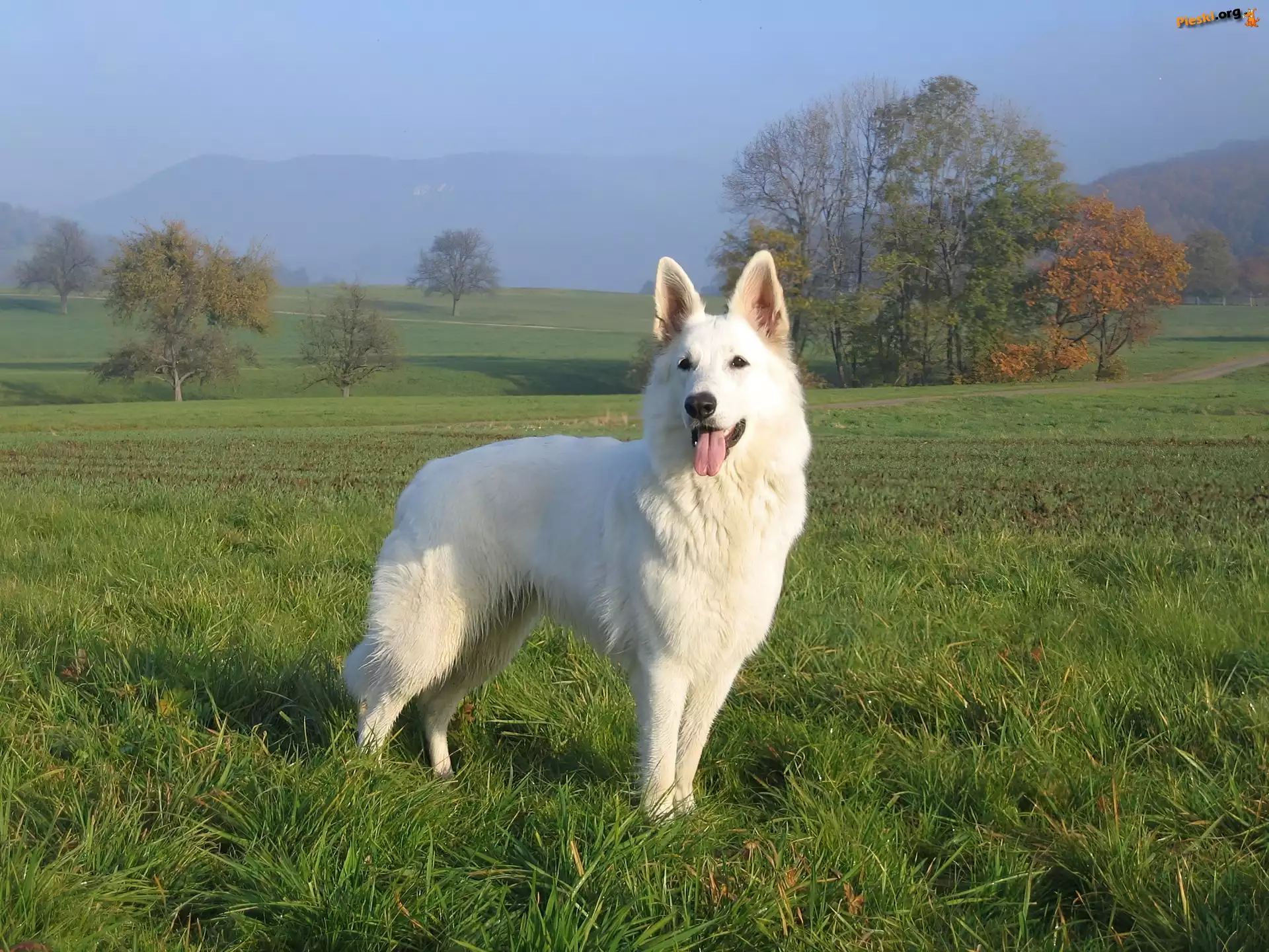 Biały Owczarek Szwajcarski, drzewa, trawa, Pieski