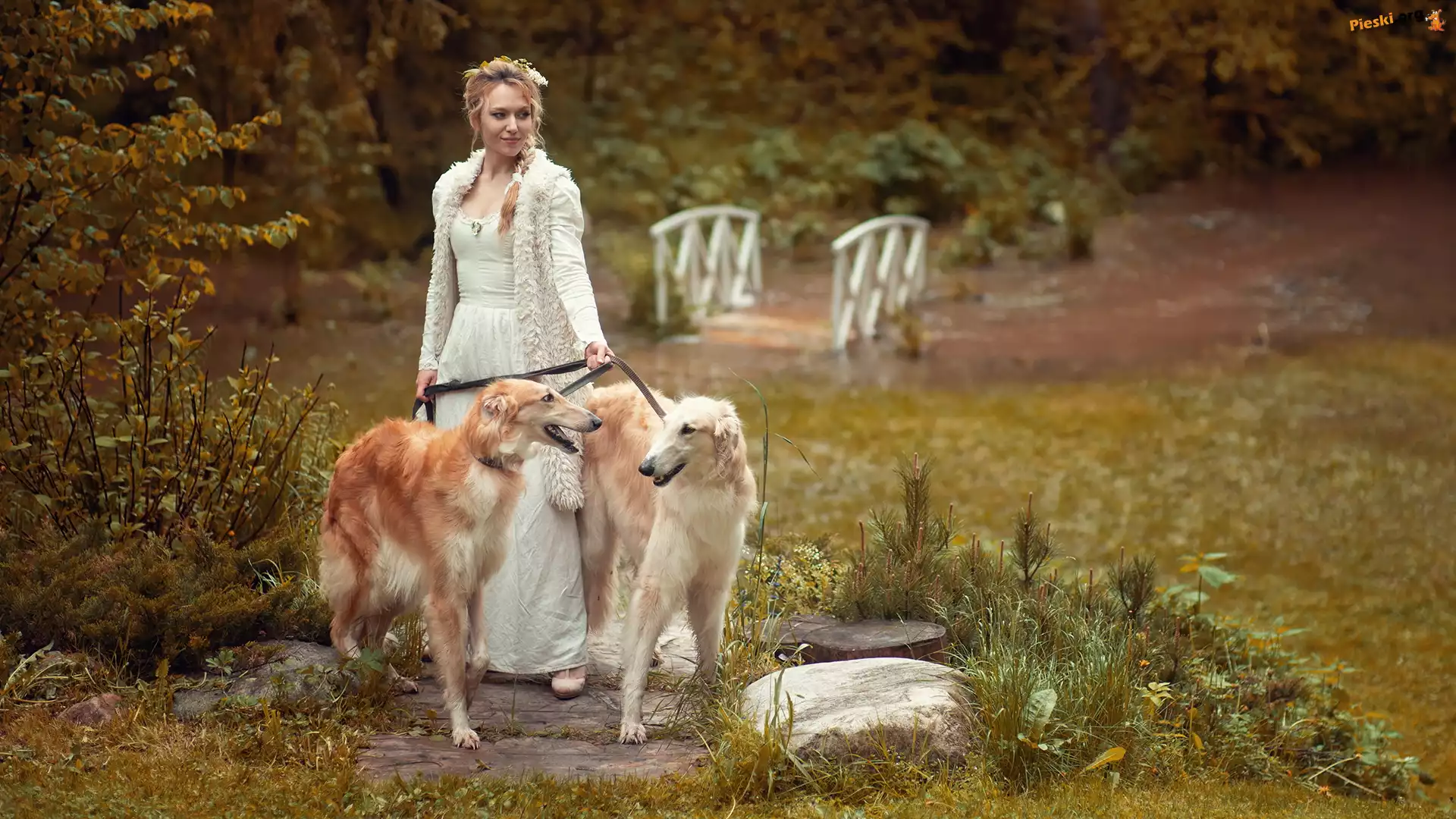 Psy, Blondynka, Kobieta, Dwa, Charty rosyjskie borzoj, Pieski