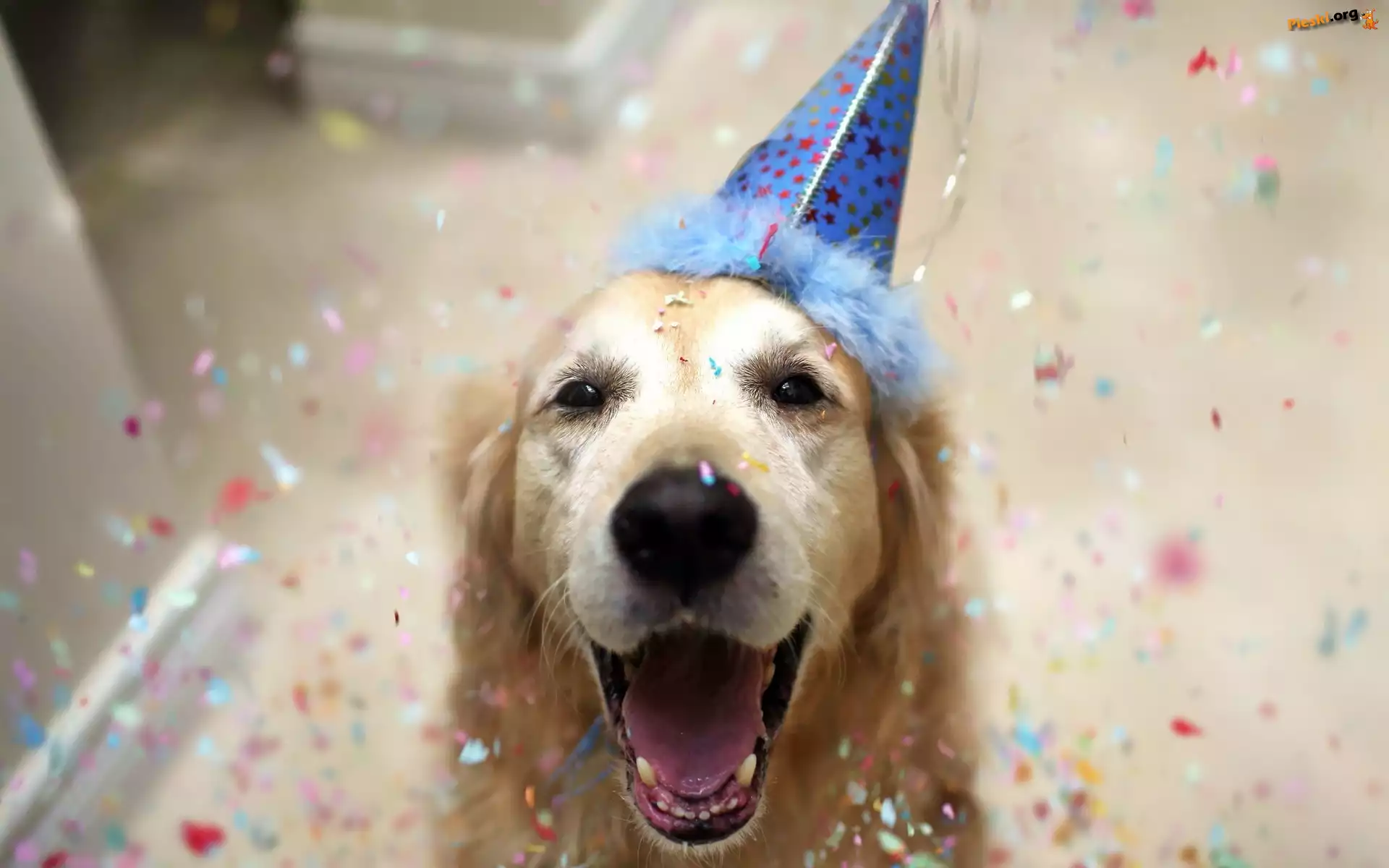 Czapeczka, Retriever, Golden, Karnawałowa, Konfetti, Pieski