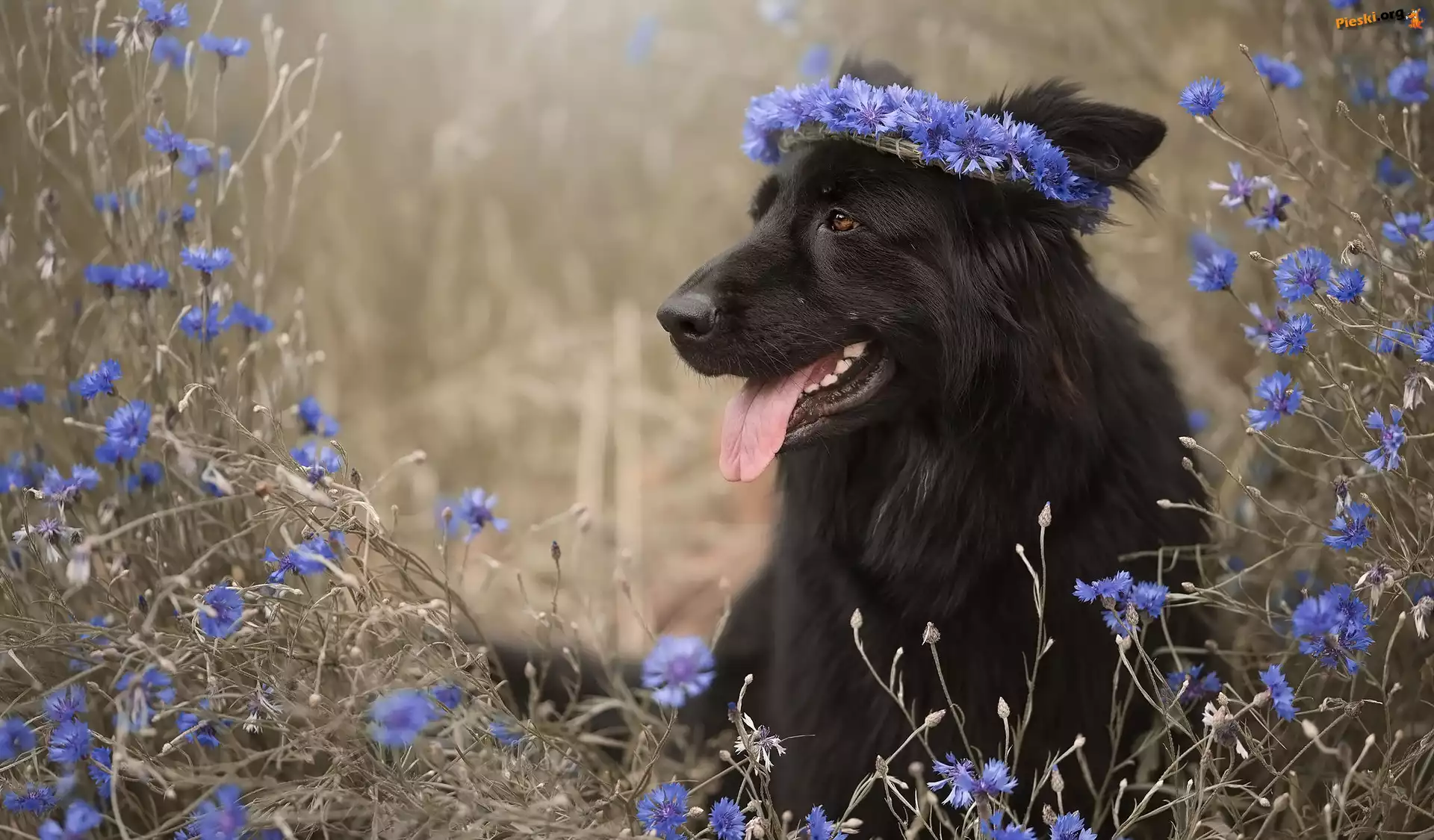 Czarny owczarek niemiecki, Kwiaty, Chabry, Pies, Pieski