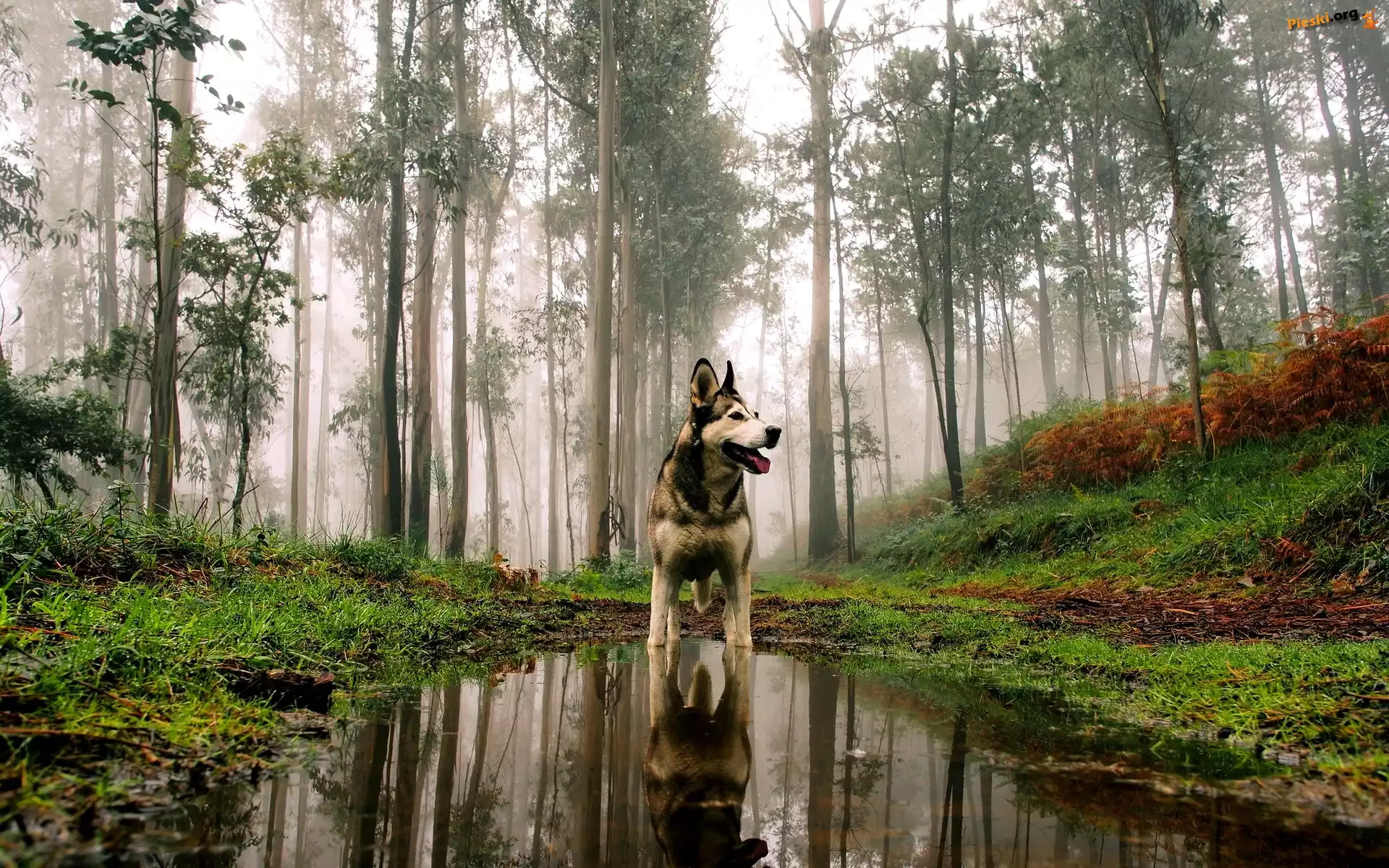 Jesień, Alaskan Malamute, Pies, Las, Kałuża