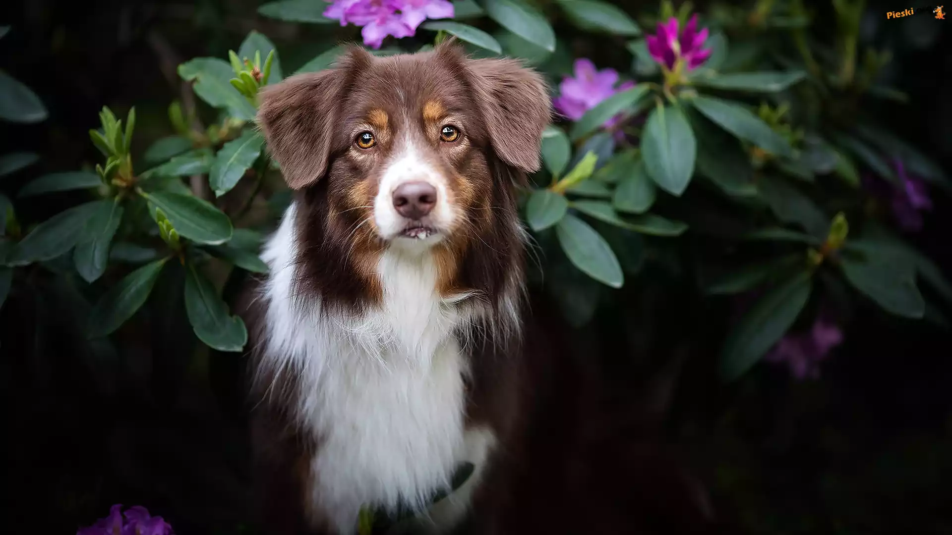 Krzewy, Owczarek australijski, Pies, Mordka, Kwiaty