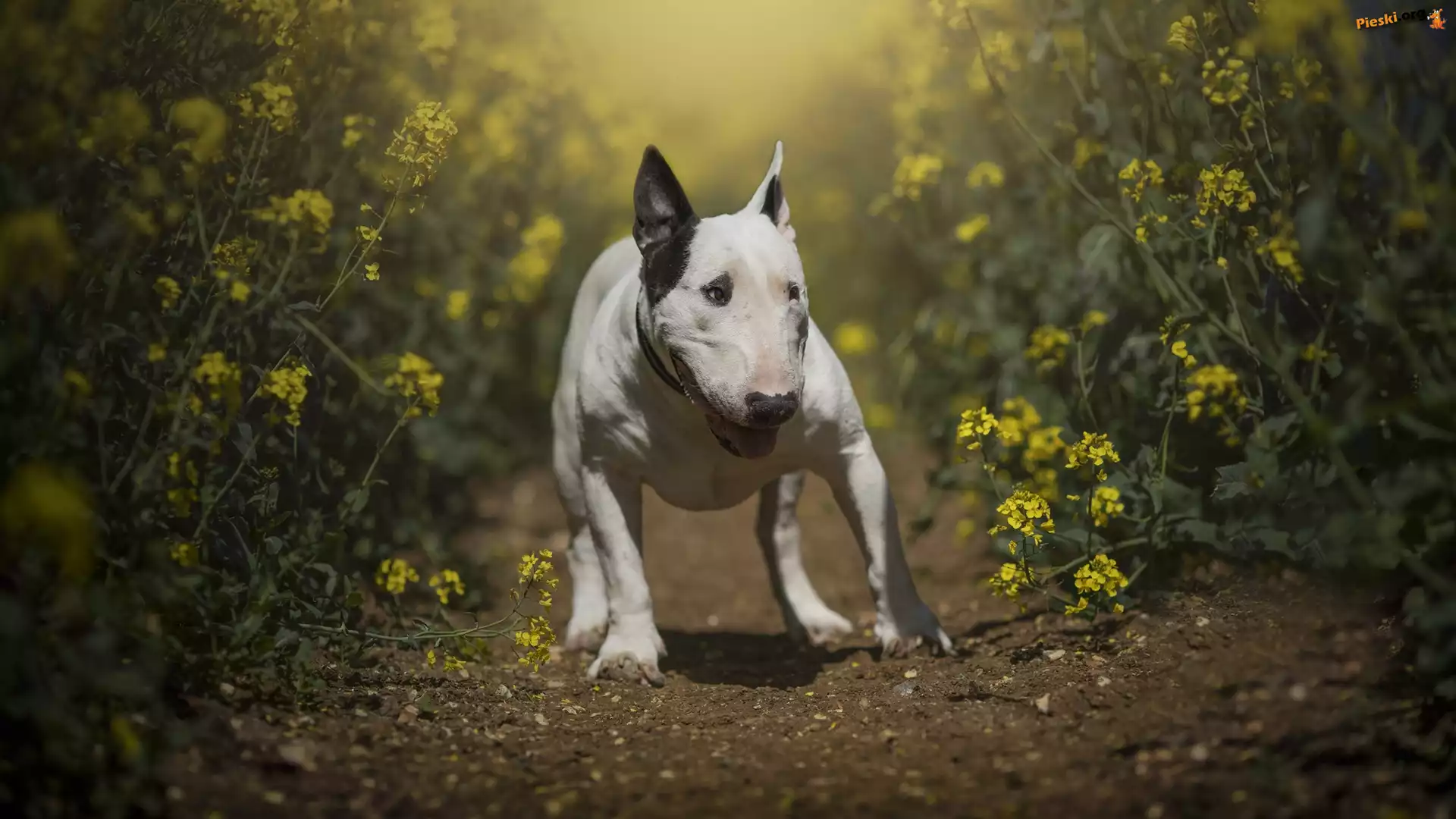 Kwiaty, Pies, Bulterier, Ścieżka, Pieski