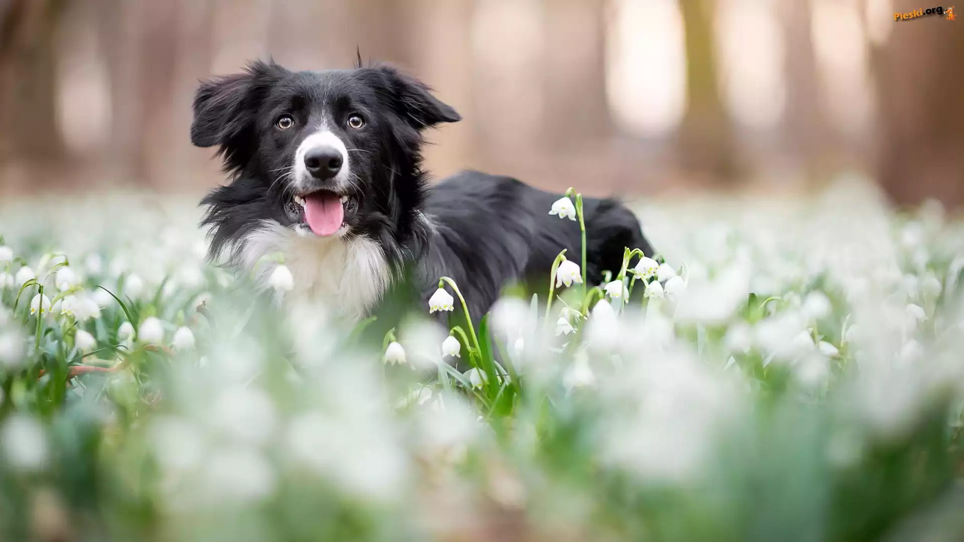 Pies, Kwiaty, Łąka, Border collie, Mordka, Śnieżyce, Pieski