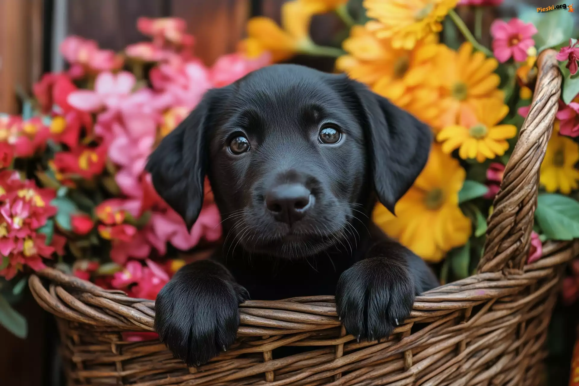 Pies, Kwiaty, Szczeniak, Koszyk, Czarny, Pieski