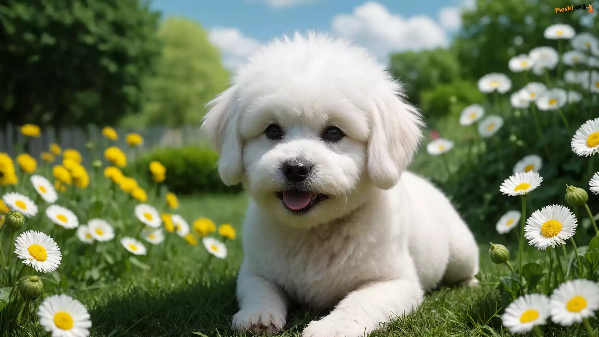 Biały, Łąka, Pies, Kwiaty, Szczeniak