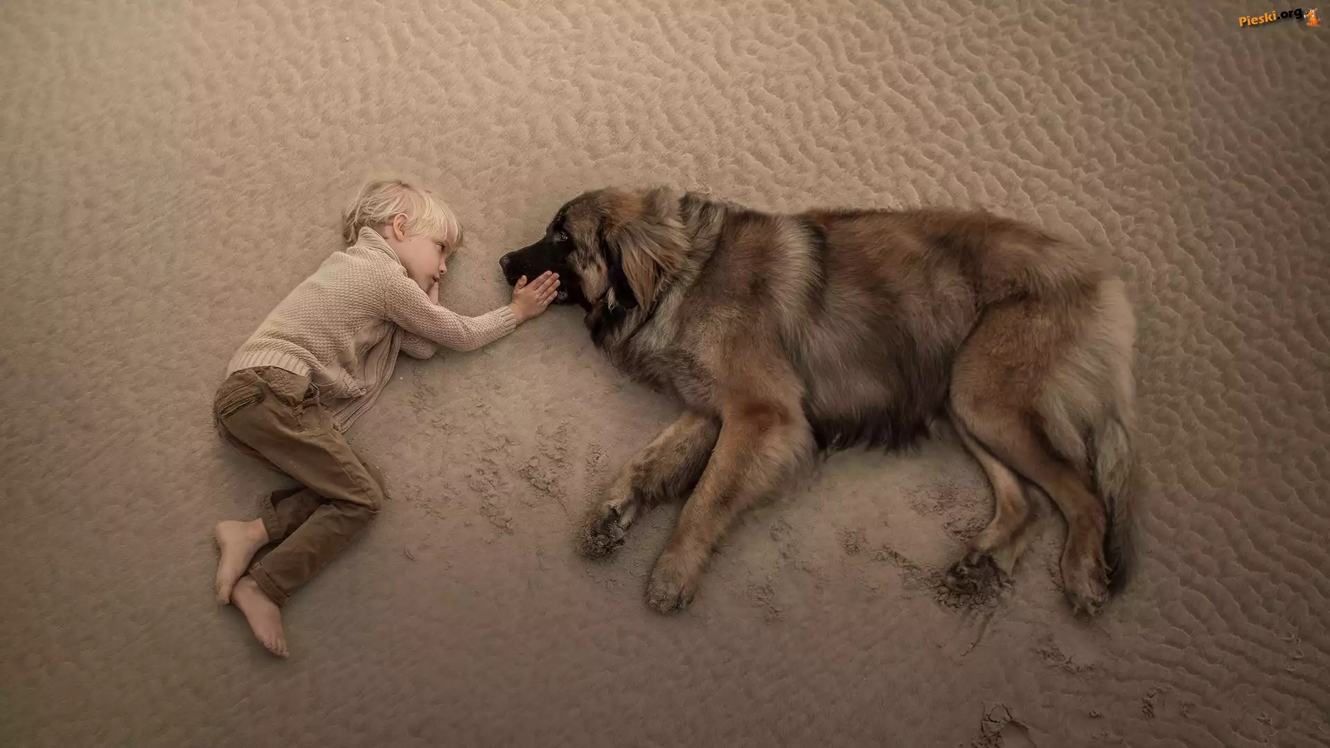 Leonberger, Chłopiec, Pies, Plaża, Pieski