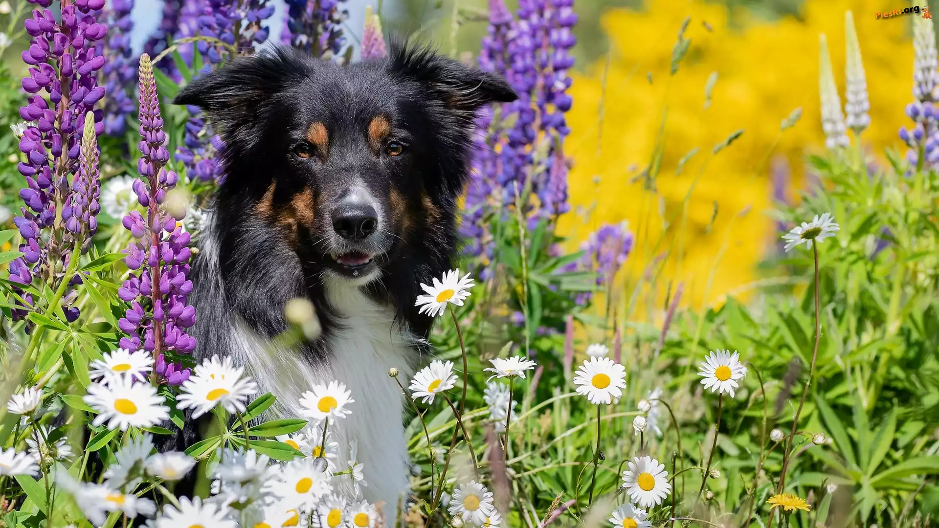 Pies, Margerytki, Łubin, Border collie, Kwiaty, Trawa