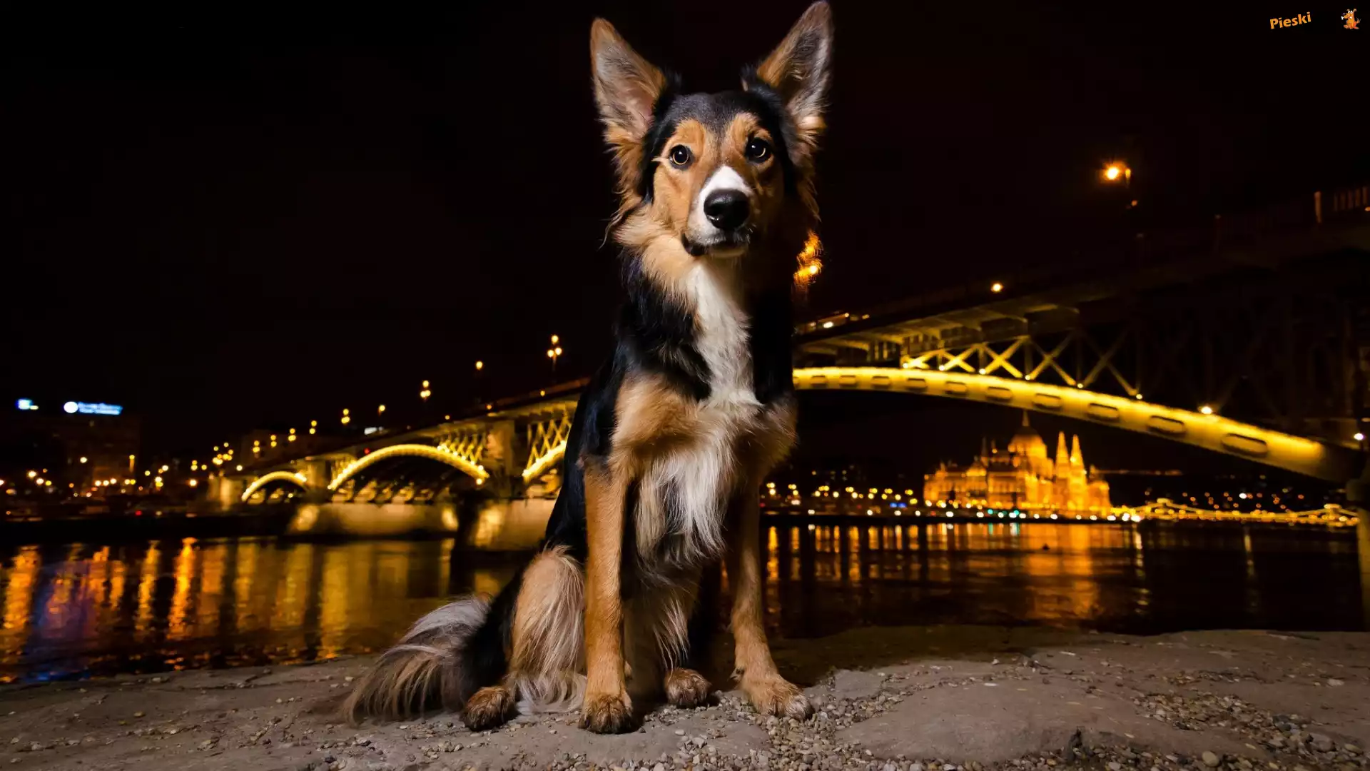 Most, Pies, Noc, Oświetlenie, Pieski
