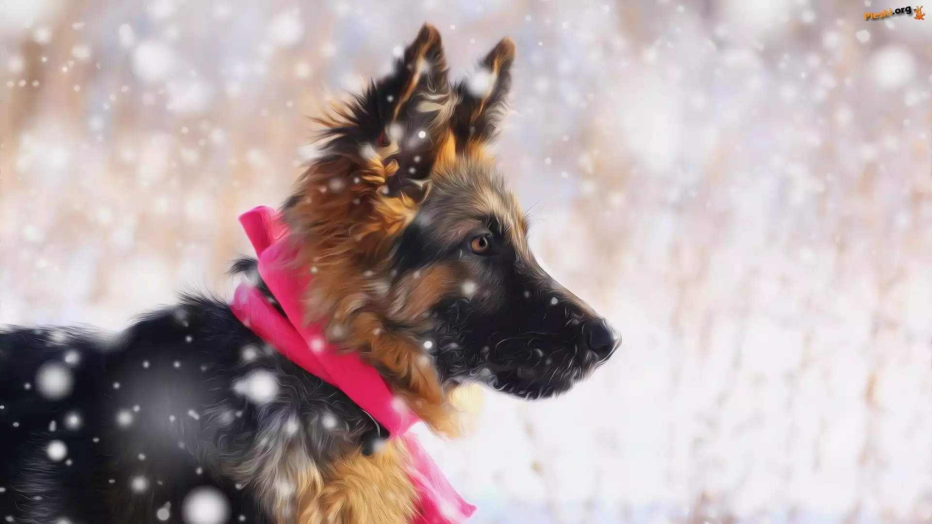 Śnieg, Szczeniak, Owczarek niemiecki, Grafika, Pieski