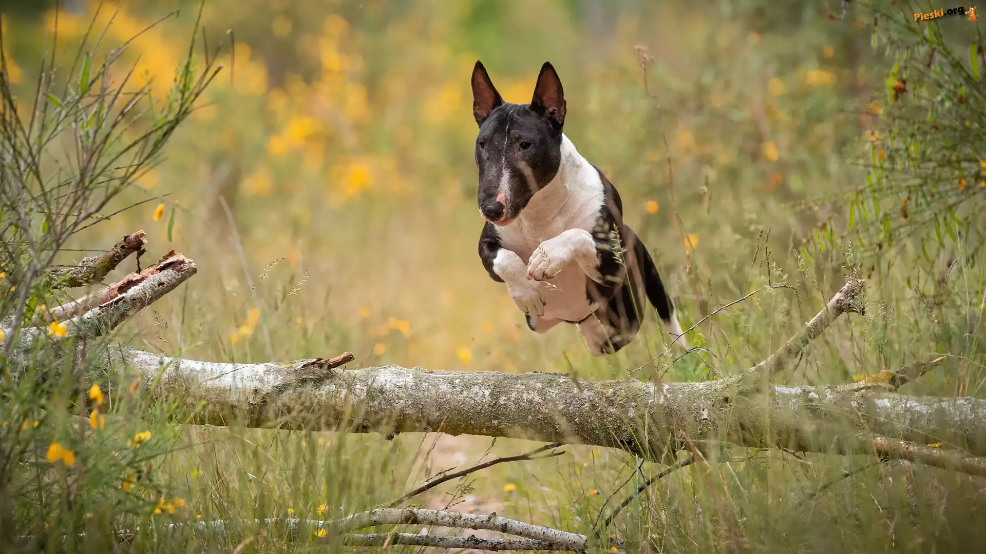 Kwiaty, Pies, Bulterier, Ścieżka Ściółka, Bulterier, Pies, Pień, Las Pies, Bulterier Pień, Bulterier, Pies, Skok, Kłoda Pies, Bulterier, Dywan Język, Bulterier, Biały, Głowa, Łata Biały, Bulterier Biały, Bulterier, Trawnik Bulteriery