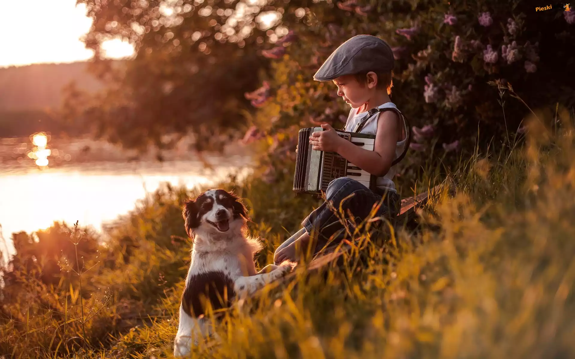 Pies, Chłopczyk, Akordeon, Rzeka, Pieski