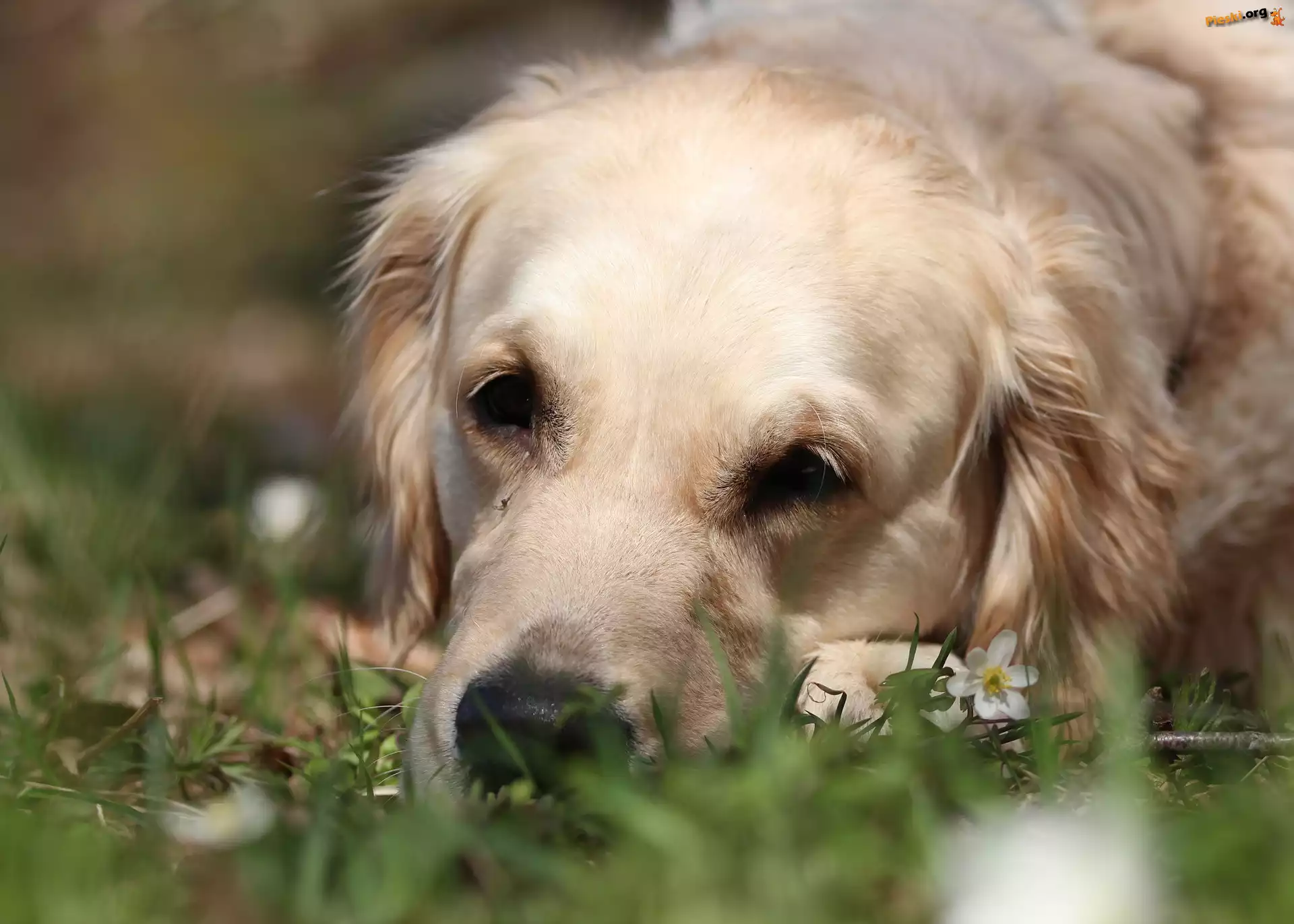Golden retriever, Biały, Pies, Trawa, Pieski