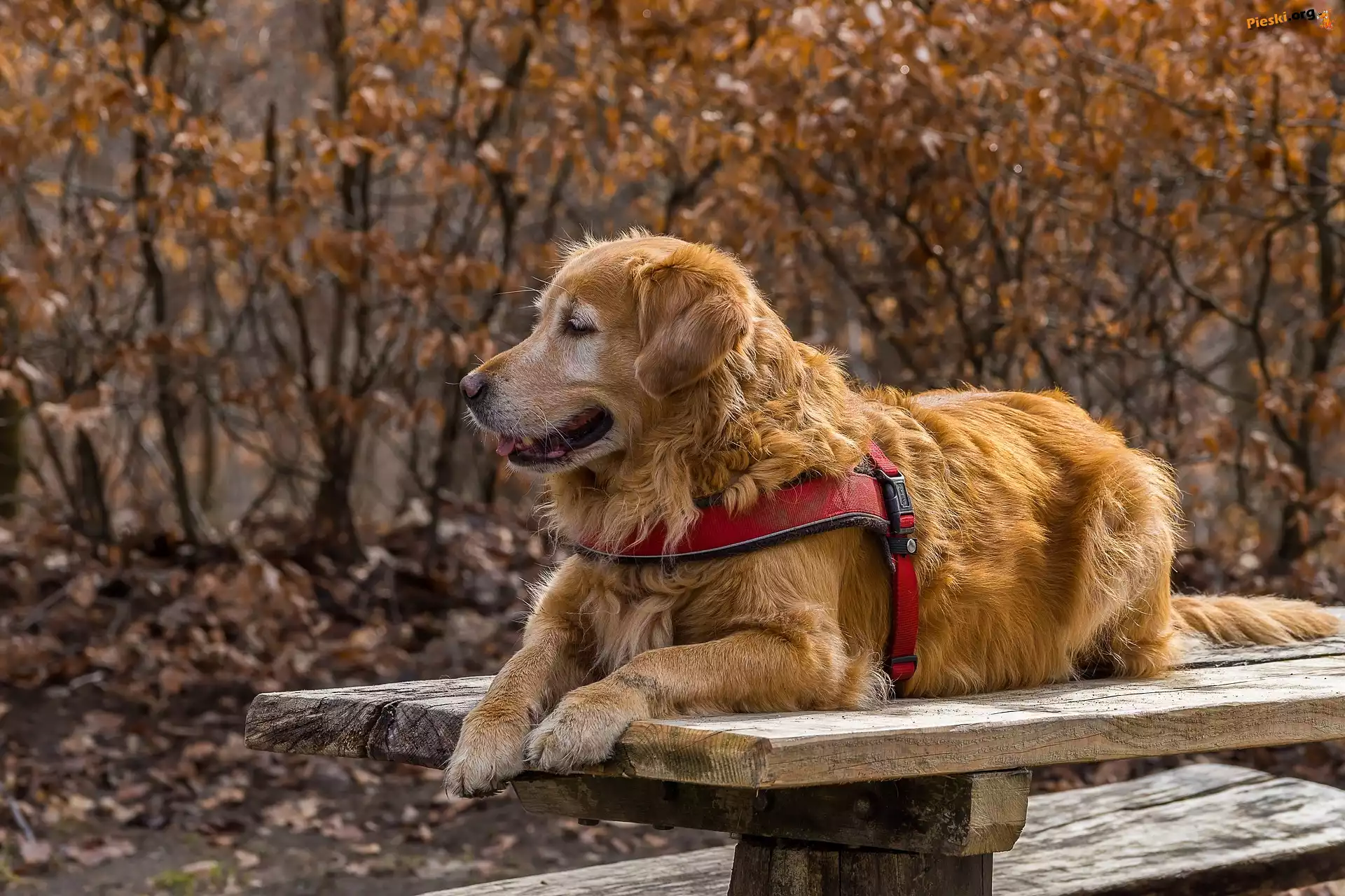 Ławka, Pies, Golden retriever, Szelki