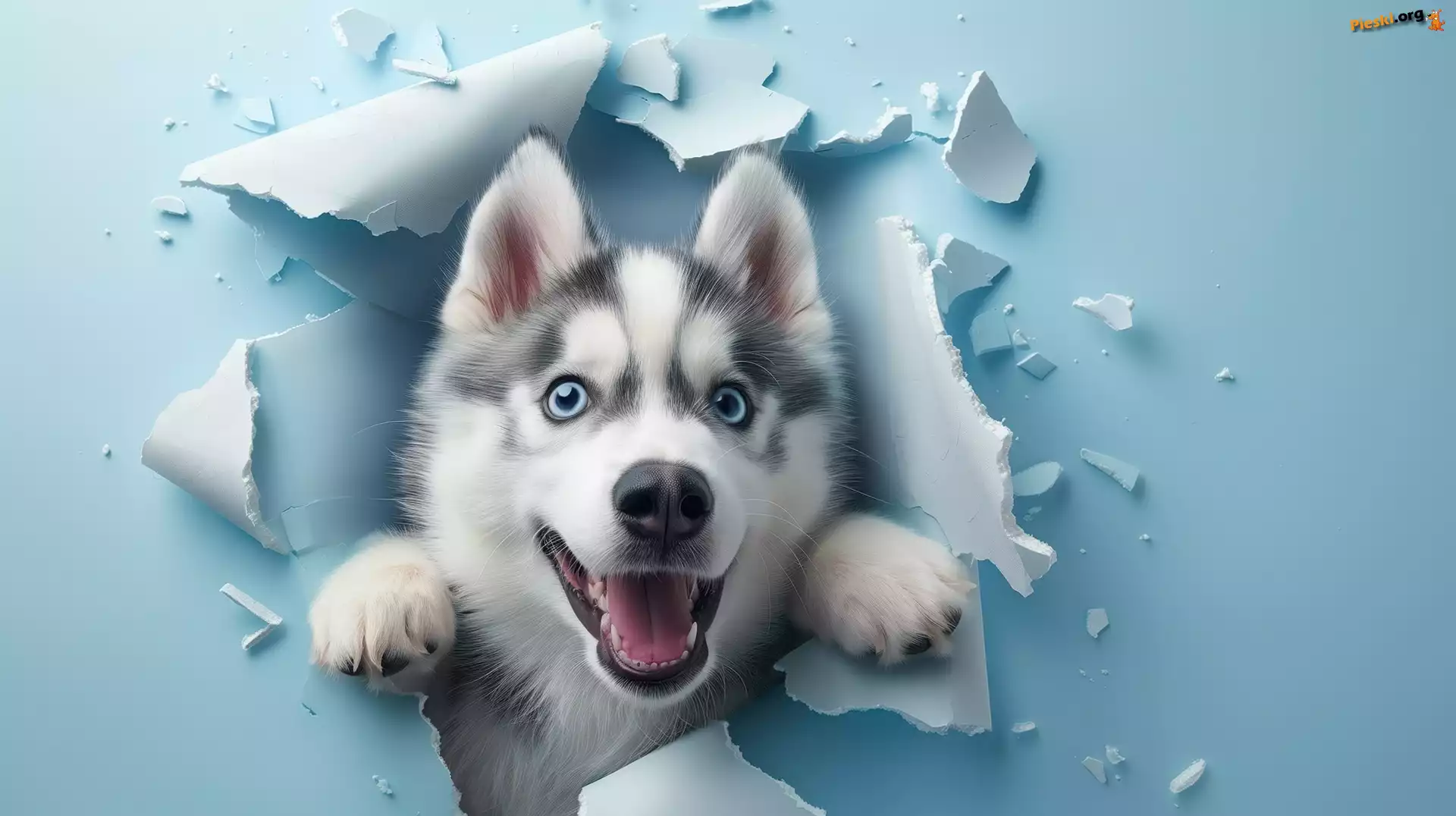 Dziura, Niebieska, Pies, Ściana, Siberian husky, Pieski
