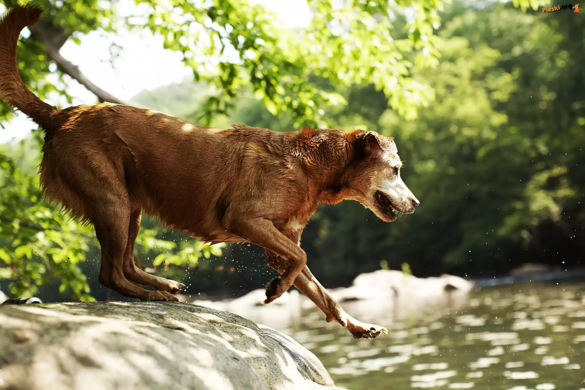 Drzewa, Skok, Pies, Woda