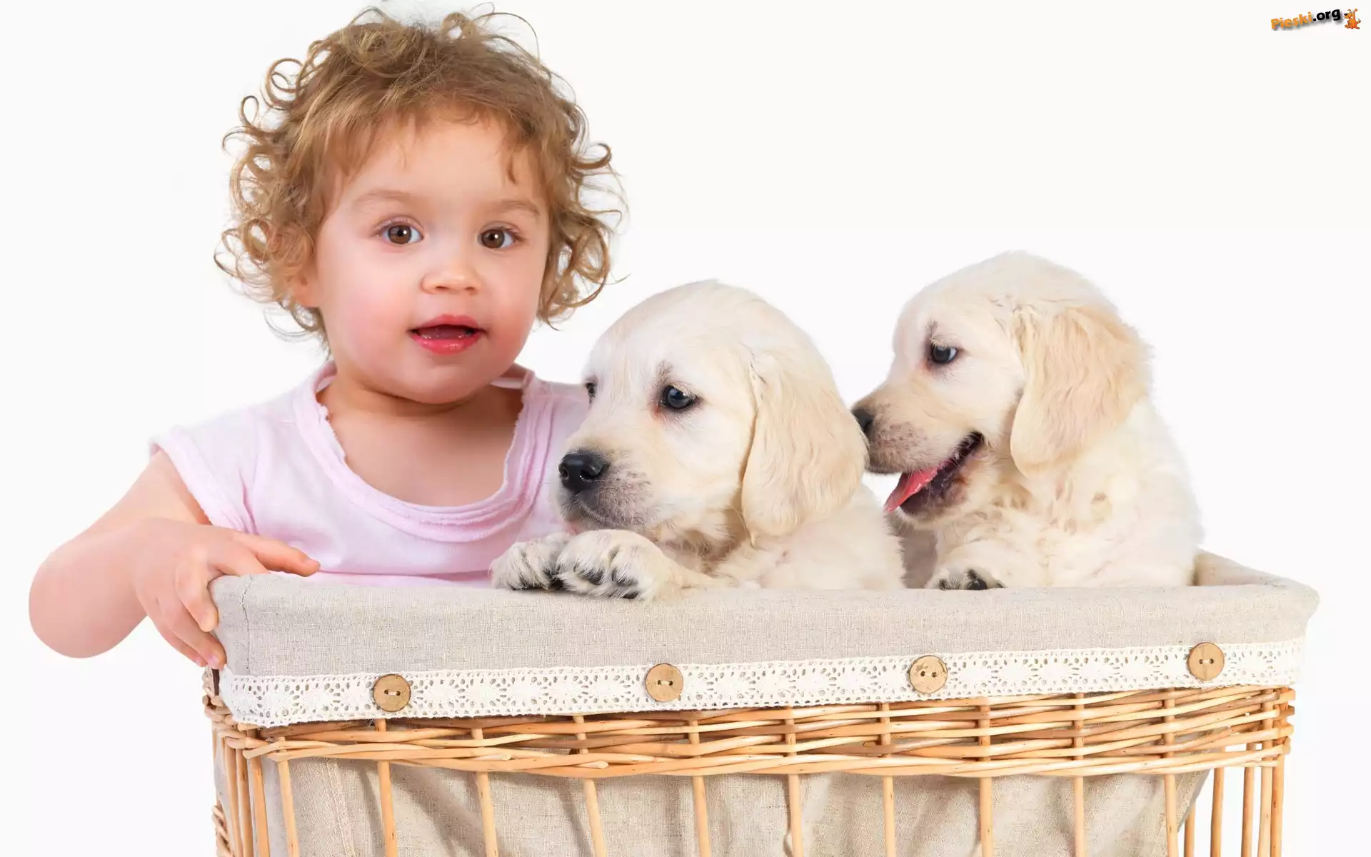 Dziecko, Szczeniaczki, Kosz, Pieski