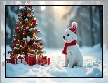 Choinka, Zima, Pies, Prezenty, Boże Narodzenie, Biały, Szczeniak