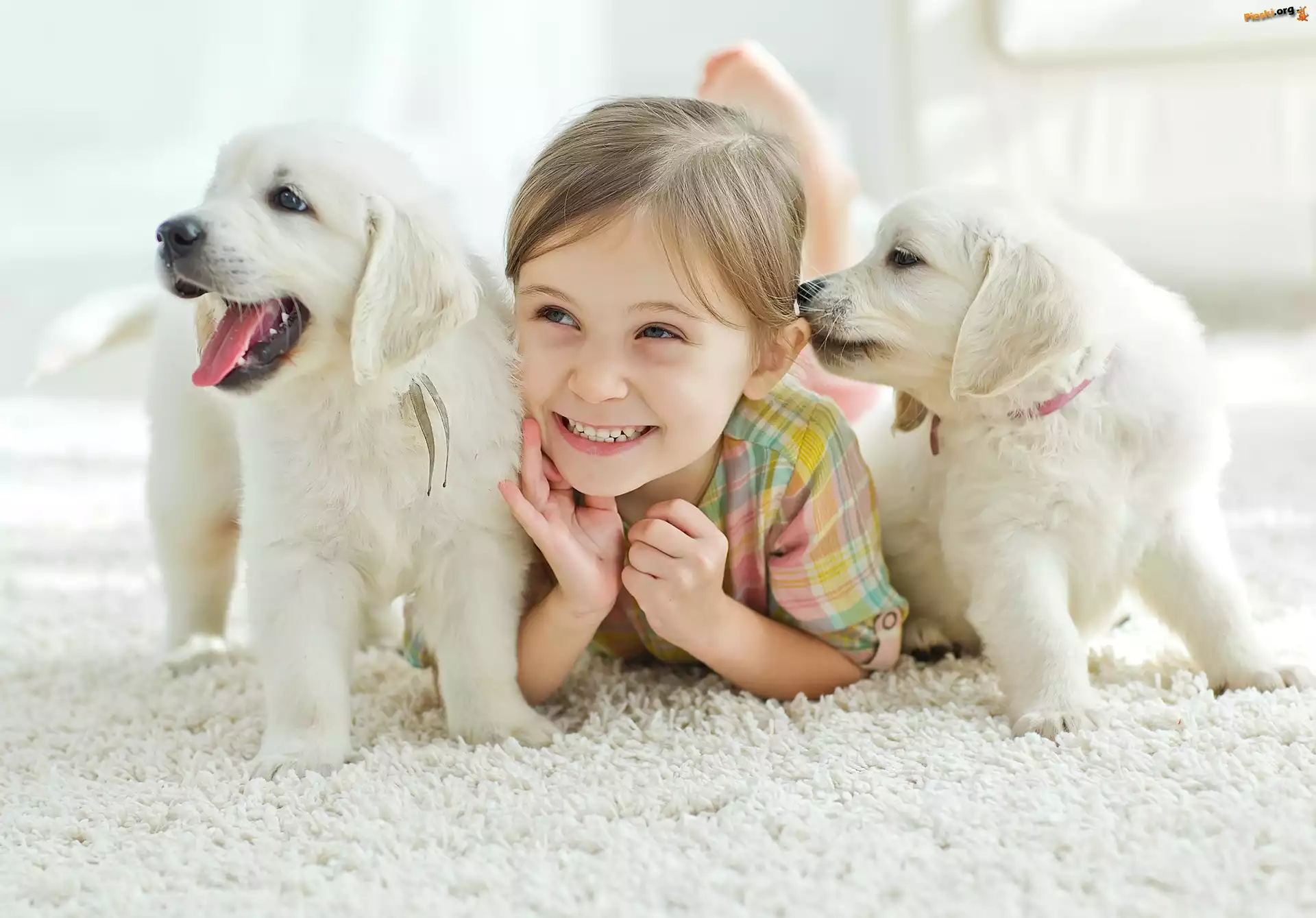 Uśmiechnięta, Szczeniaki, Białe, Dziewczynka, Dwa, Golden retriever, Pieski