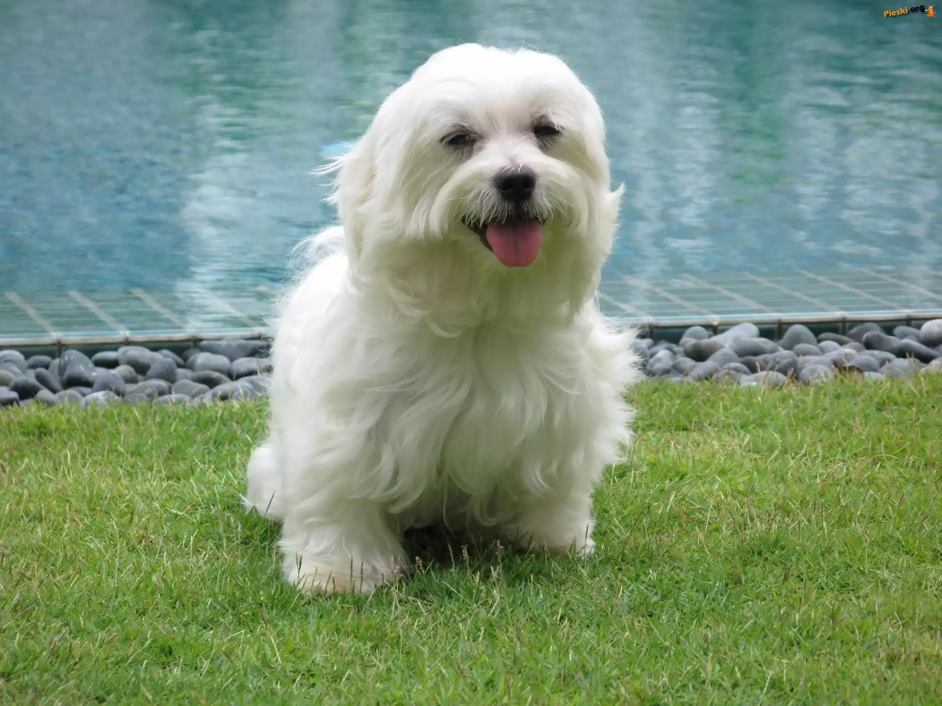 Dwa, Coton de Tulear Młoda, Kobieta, Pies Coton de Tulear, fotel Kokardka, Coton de Tulear, Piesek Trawa, Biały, Piesek, Basen Biały, Coton de Tulear Szczeniak, Biały, Pies, Coton de Tulear Piesek, Coton de Tulear, Łąka