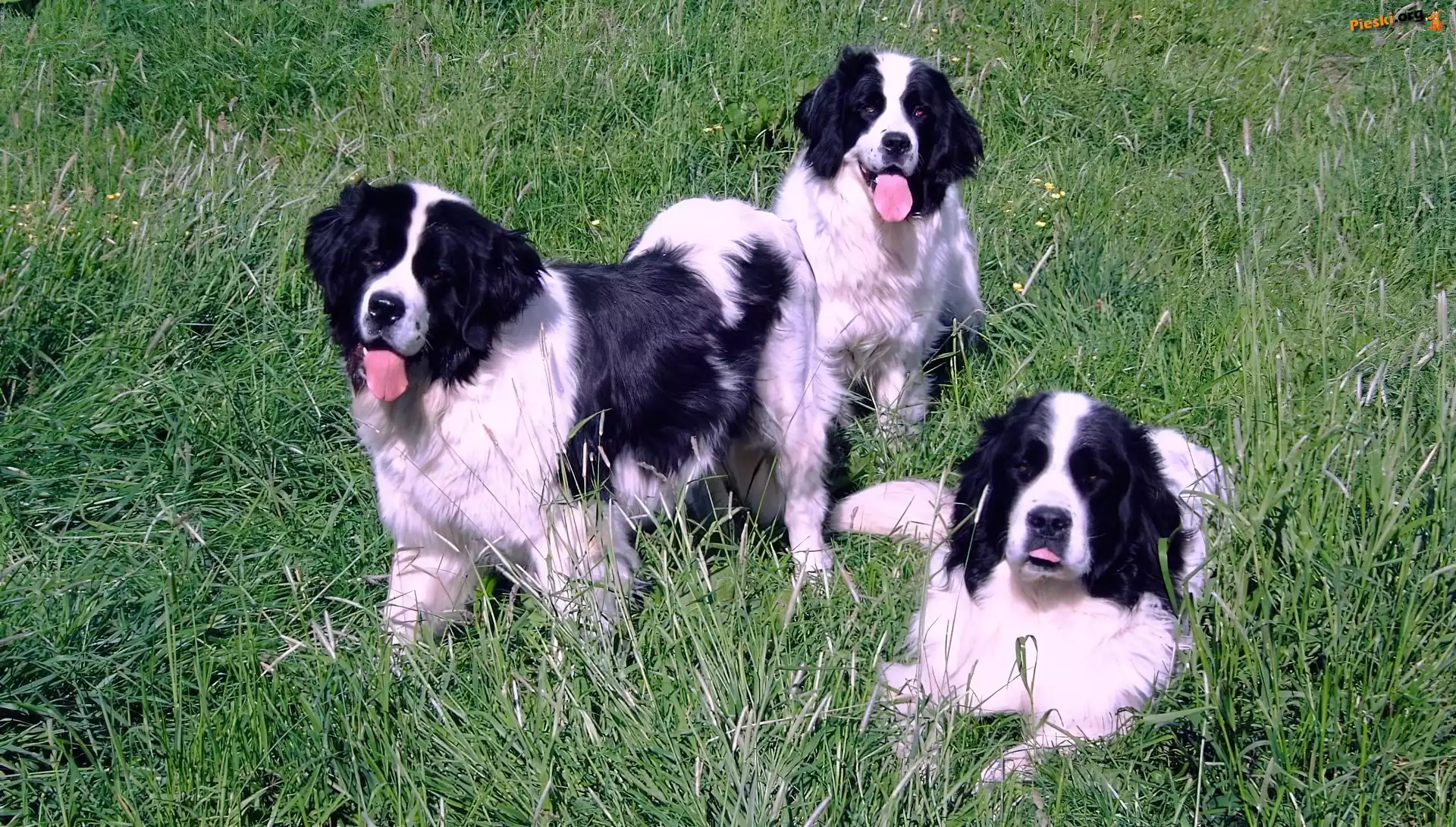 trawa, zielona, Landseer trzy, Landseery kratka, chustki, Landseer biegnący, Landseer Piesek, Łąka biało-czarny, Landseer morda, Landseera słodkie, szczeniaki, Landseery Kot, Pies, Słodkie mordka, Landseera pysk, Landseera Morda, Landseera