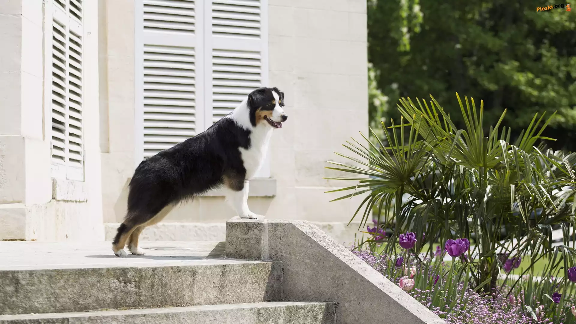 Pies, Tulipany, Schody, Owczarek australijski, Dom, Palma, Pieski
