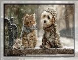 Grafika AI, Kot, Ubranka, Pies, Zima, Ławka, Pieski
