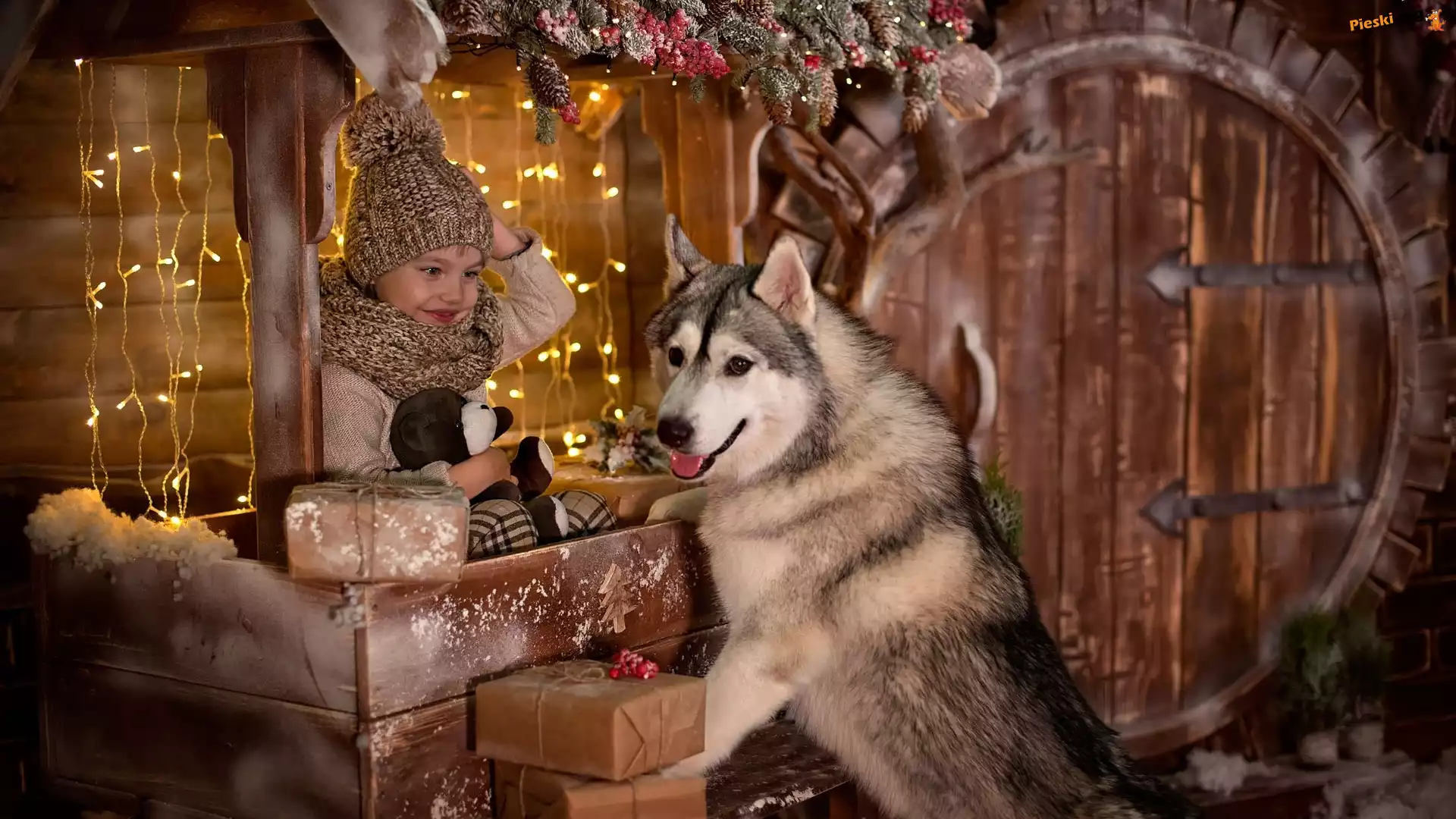 Świątecznie, Pies, Dziecko, Siberian husky, Światełka