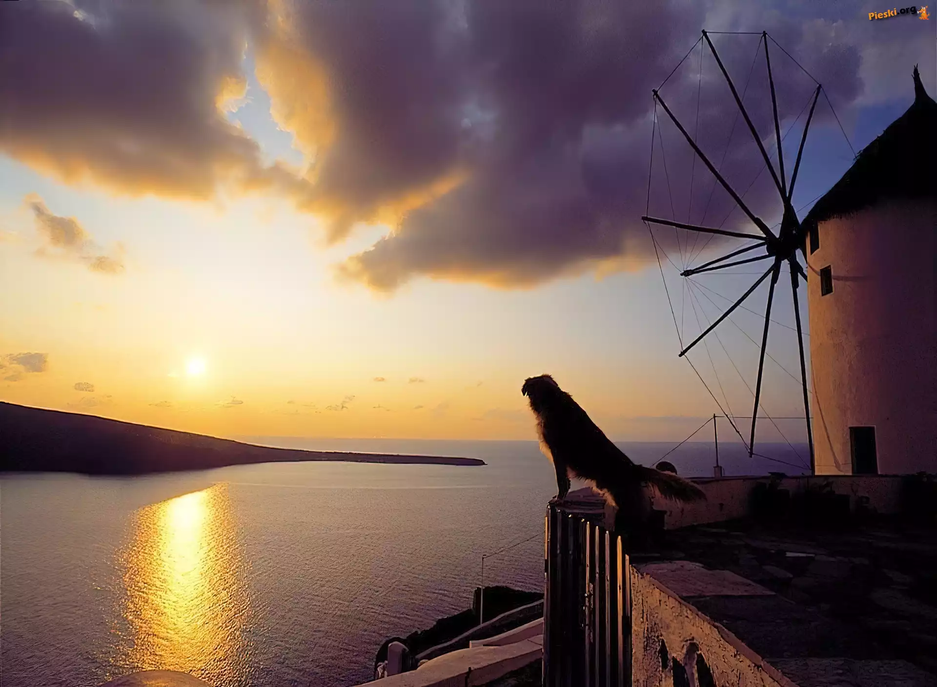 Zachód, Pies, Wiatrak, Słońca, Pieski